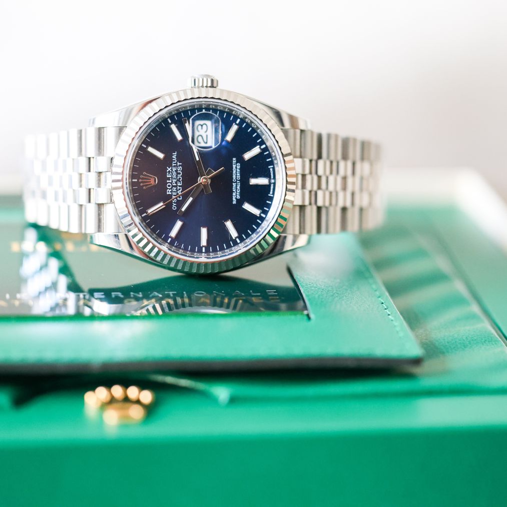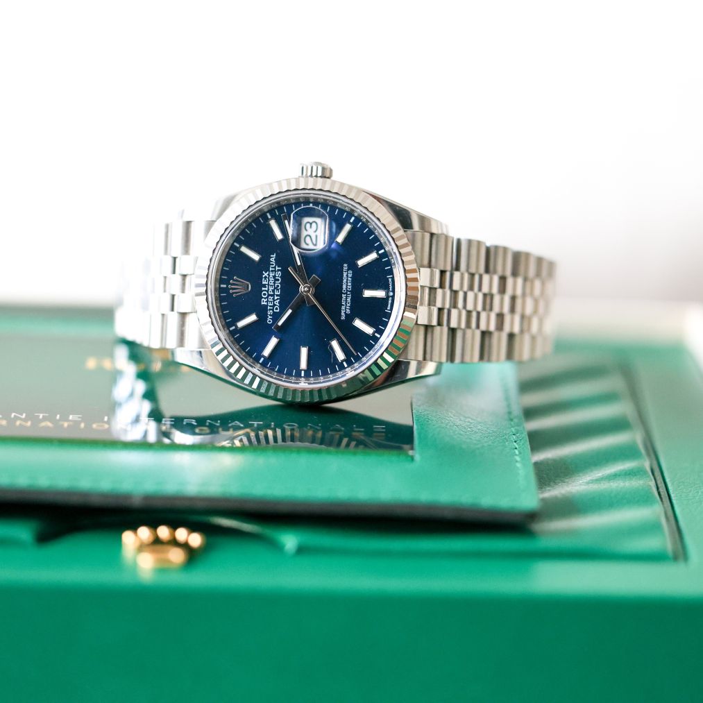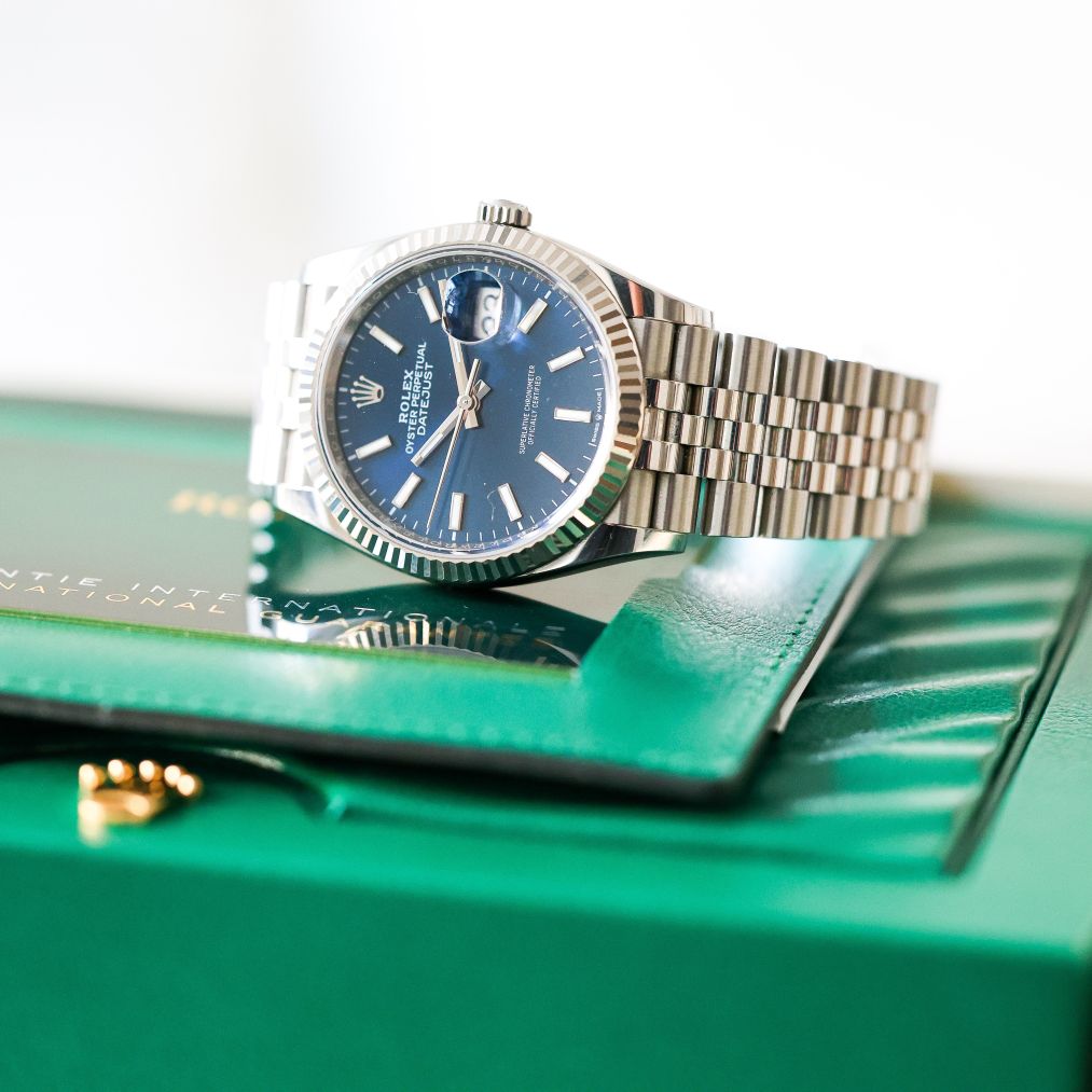 The Rolex Datejust 36MM blue dial on the jubilee bracelet. This watch is dated 2022 complete with box and papers available immediately.