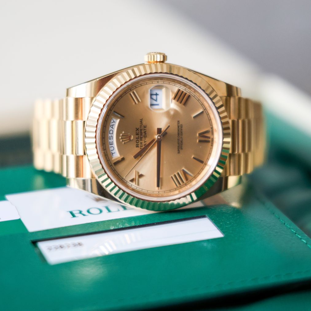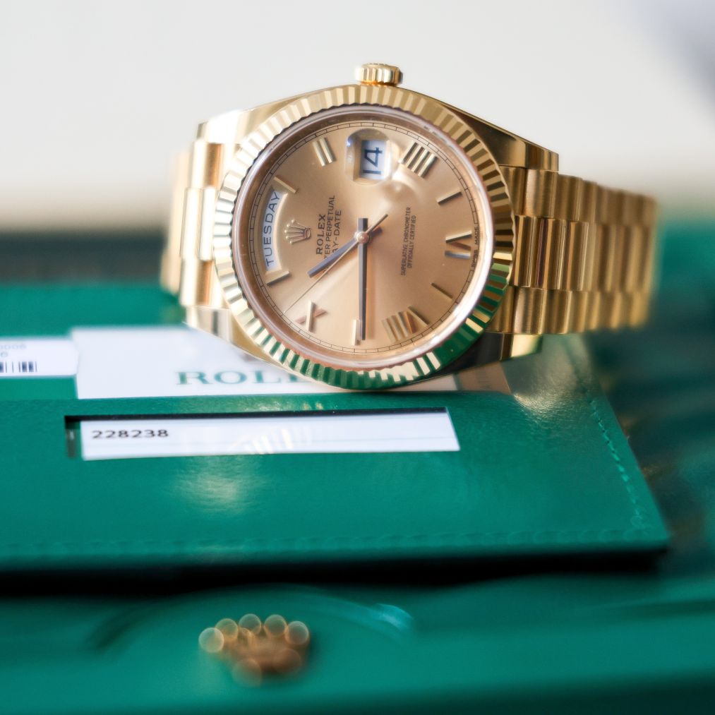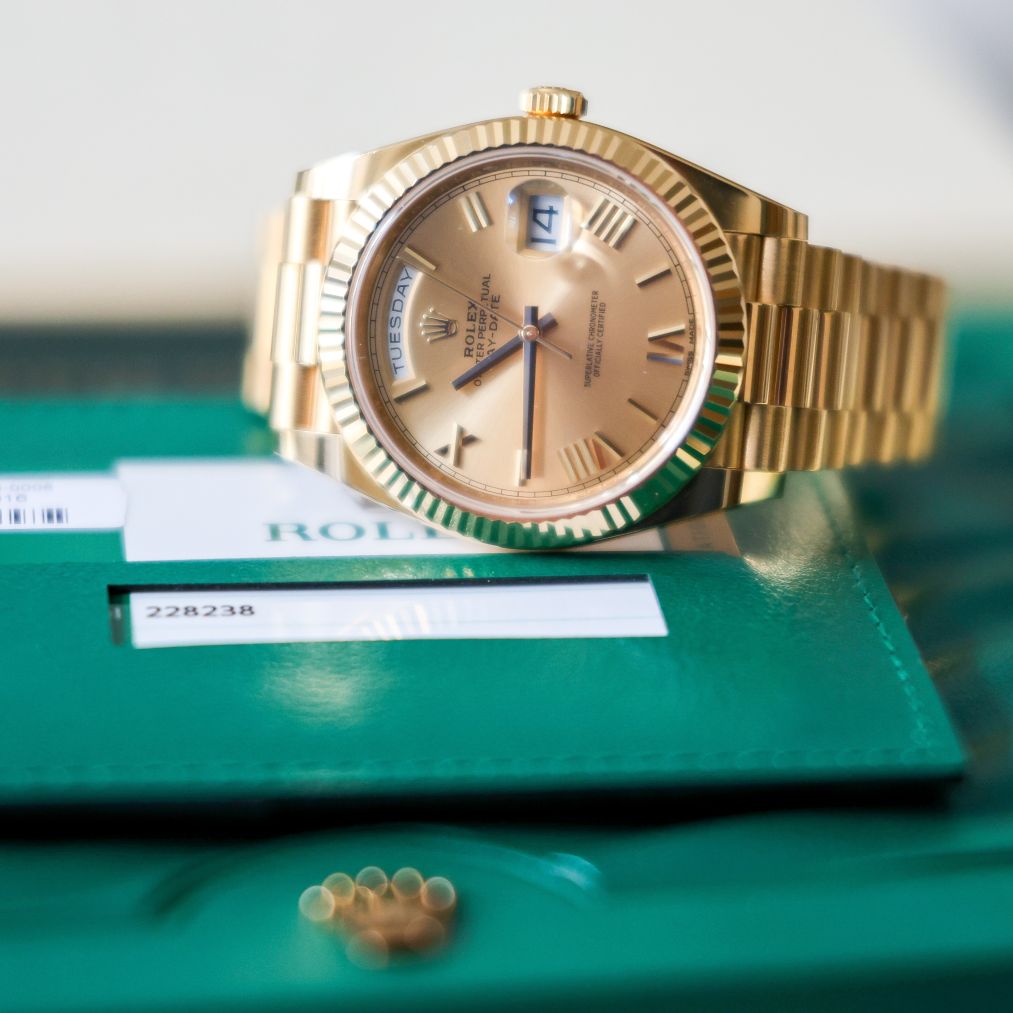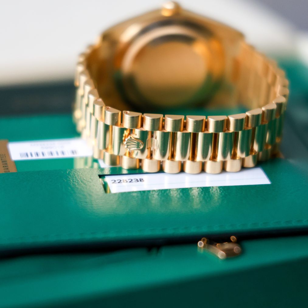 Here we have a stunning example of the Rolex Daydate 228238 in yellow gold. Complete with all the original bits and bobs from Rolex its on sale now.